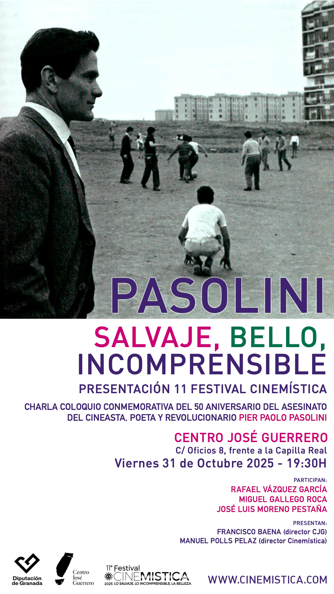 Os esperamos ESTE VIERNES 31 OCTUBRE 19.30H EN EL CENTRO JOSÉ GUERRERO, José Luis Moreno Pestaña, Rafael Vázquez García y Miguel Gallego Roca establecerán un coloquio encendido y abierto a los asistentes, sobre el legado de Pasolini «hoy»! También se presentará el cartel de Cinemistica de este año y el programa.